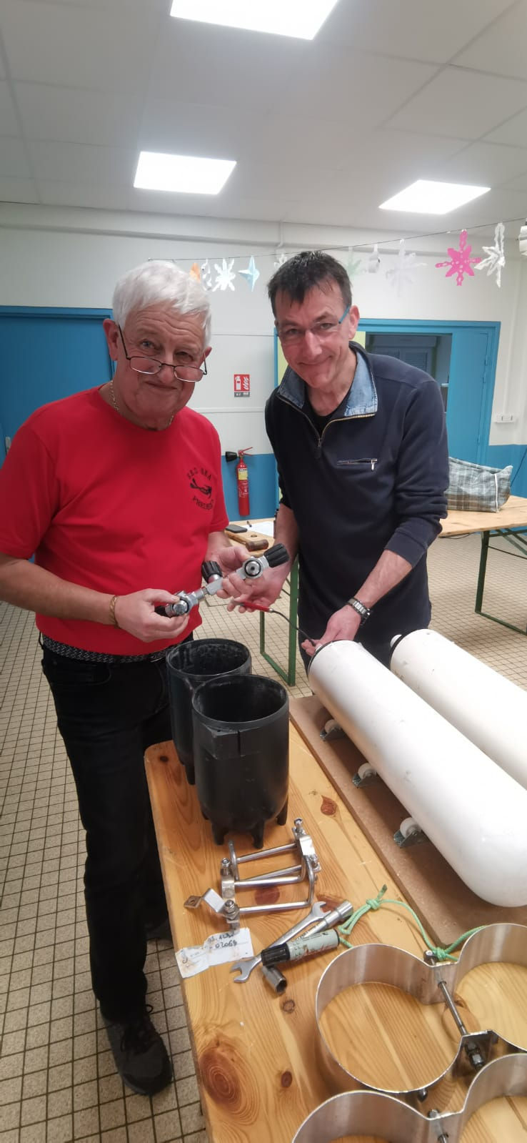 Sous la supervision d'Olivier, notre responsable matériel, les TIV du C.S.C. (Techniciens en Inspection Visuelle) ont démonté, vérifié les filetages, changé les joints des robinets, mais aussi vérifié les filetages des bouteilles et les parois internes et externes de ces dernières.